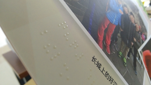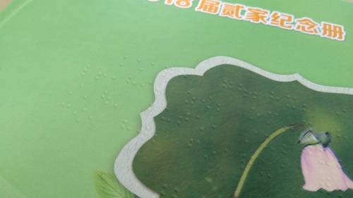 一個架子上,放著一疊厚實的精裝冊子,封面寫著“2018屆貳家紀念冊”。翻開冊子,與以往見到的一樣,紙面印著一張張燦爛而純真的笑臉和一些文字,不一樣的是,紙面上還多了一些微微凸起圓點,大約厚度1mm左右,按一種特有的規(guī)律排列,看起來晶瑩剔透,用手撫摸一下,顆粒感很真實,這就是“盲文畢業(yè)紀念冊”。